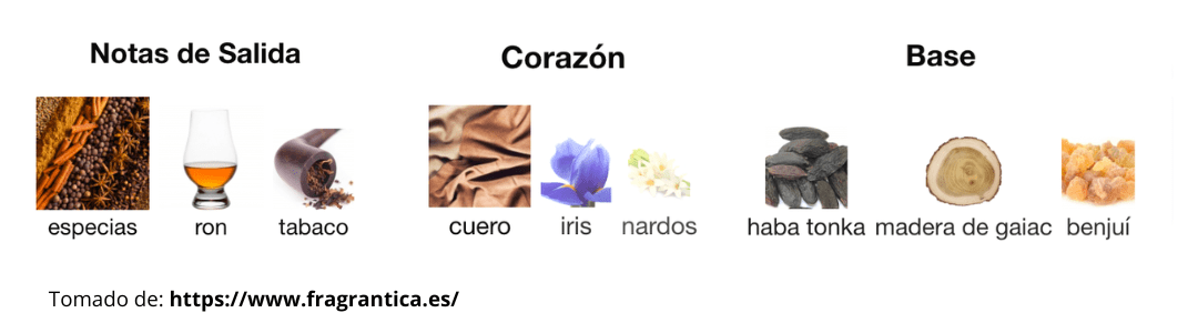 Imagina que estás en un bar de lujo, sentado en un sillón de cuero fino, mientras bebes un vaso del ron más caro y especiado. El aire se impregna con el humo dulce del tabaco y el calor de las especias. Es una fragancia que no pide permiso, llega e impone. Es cálida, licorosa y extremadamente masculina. El aroma de un hombre poderoso, con un carácter fuerte y una confianza arrolladora.
