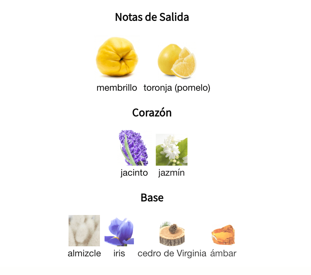 Notas de Salida: 🌶️ Pimienta Rosa. Notas de Corazón: ❤️ Jazmín e Iris. Notas de Fondo: 🍦 Pachulí, Almizcle y Vainilla.