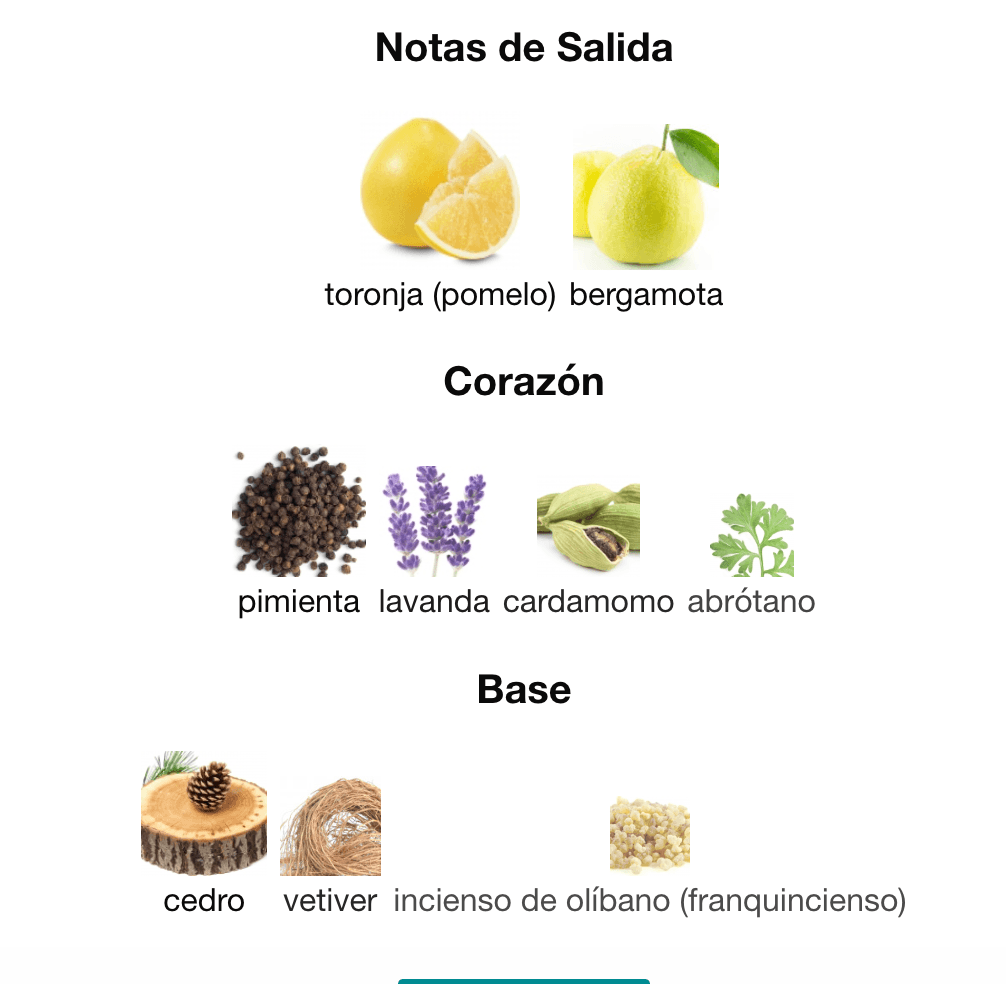 Notas de Salida: 🍊 Toronja (Pomelo) y Bergamota. Notas de Corazón: ❤️ Pimienta, Lavanda, Cardamomo y Abrótano. Notas de Base: 🪵 Cedro, Vetiver e Incienso de Olíbano.