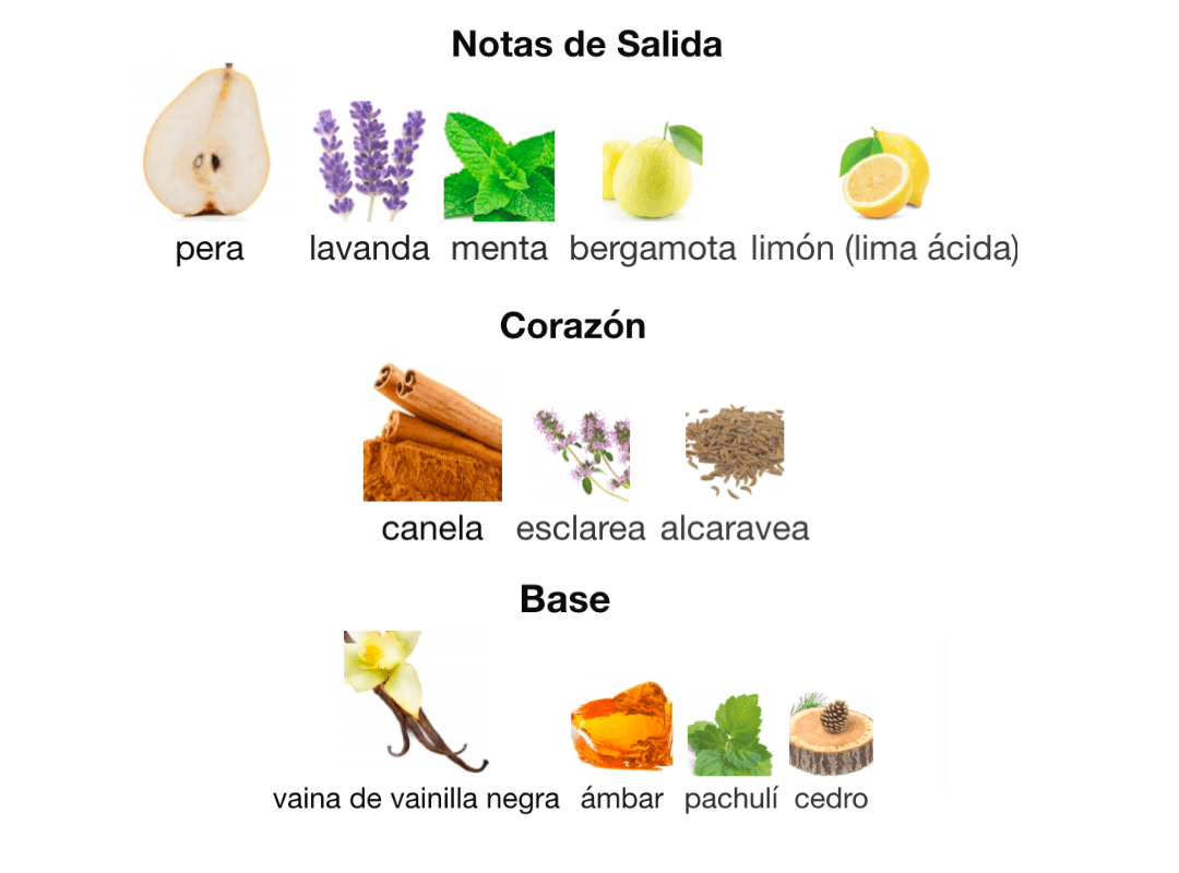 Notas de Salida: 🍐 Pera, Lavanda 💜, Menta, Bergamota 🍊 y Limón 🍋. Notas de Corazón: ❤️ Canela, Esclarea y Alcaravea. Notas de Base: 🍦 Vaina de Vainilla Negra, Ámbar, Pachulí y Cedro 🪵.