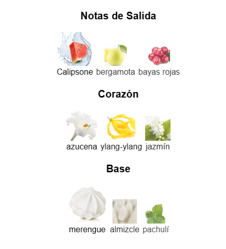 Notas de Salida: 🌊 Calipsone, Bergamota 🍊 y Bayas Rojas. Notas de Corazón: ❤️ Azucena, Ylang-Ylang y Jazmín. Notas de Base: 🍥 Merengue, Almizcle y Pachulí.