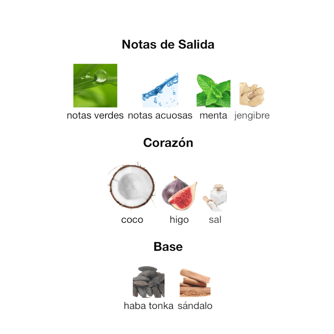 Imagina que entras en un jardín secreto y tropical. Lo primero que sientes es una explosión de menta fresca y notas verdes 🌿, como si acabaras de cortar hojas en la jungla. Inmediatamente, te golpea el olor de un coco cremoso 🥥 y un higo dulce, mezclados con un toque sorprendente de sal marina 🧂. Es una fragancia que te transporta a una playa paradisíaca, dulce, fresca y acuática, todo al mismo tiempo.