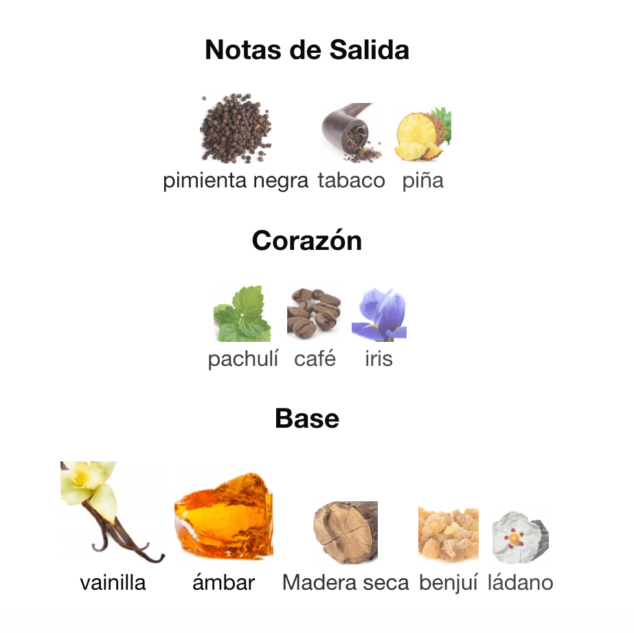 Imagina una piña jugosa y dulce, pero en lugar de ser fresca, está envuelta en el humo de tabaco de pipa y pimienta negra picante. A medida que seca, se vuelve más oscuro y cremoso con notas de café y vainilla, pero sin perder ese toque especiado. Es una fragancia cálida, masculina y muy especiada, que proyecta una confianza arrolladora.