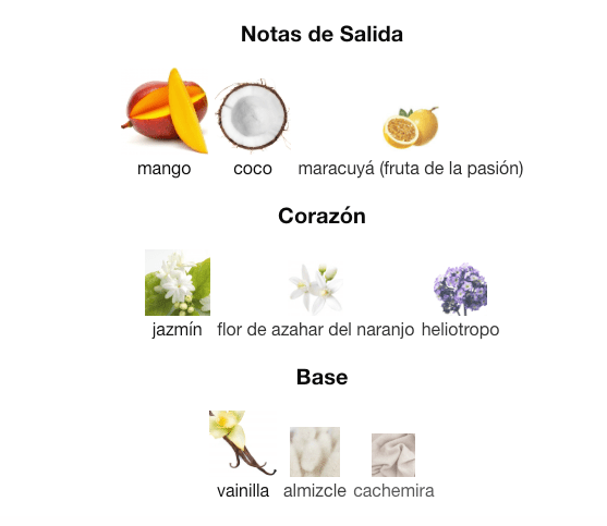 Notas de Salida: 🥭 Mango, Coco 🥥 y Maracuyá (Fruta de la Pasión). Notas de Corazón: ❤️ Jazmín, Flor de Azahar del Naranjo y Heliotropo. Notas de Base: 🍦 Vainilla, Almizcle y Cachemira.