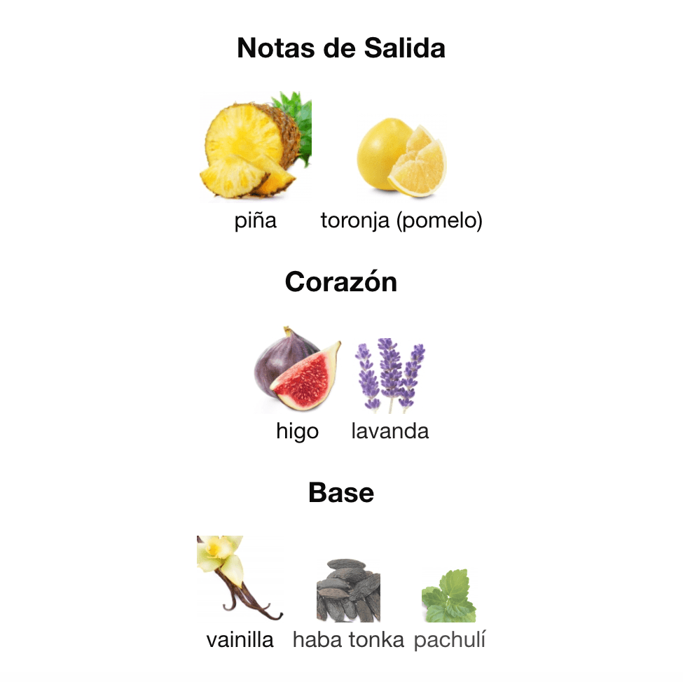 Imagina una piña madura y súper jugosa 🍍 asada a la parrilla, lo que le da un toque ahumado y dulce. Luego, se mezcla con un higo cremoso y una lavanda que le aporta una frescura limpia y masculina. No es el típico perfume frutal, la base de vainilla y pachulí le da un toque terroso, dulce y muy elegante. Es una fragancia que proyecta confianza, poder y un lujo relajado.