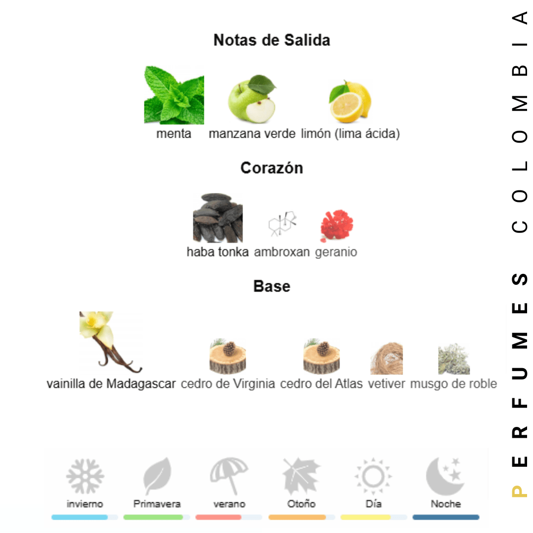 Imagina una manzana verde súper crujiente 🍏 cubierta con hojas de menta fresca y un chorro de jugo de limón. Pero no es solo un perfume fresco, el fondo de vainilla dulce y haba tonka lo hace increíblemente sexy, cremoso y perfecto para la noche. Es una fragancia que juega con el contraste entre lo fresco y lo dulce, creando un aroma que es imposible de ignorar.